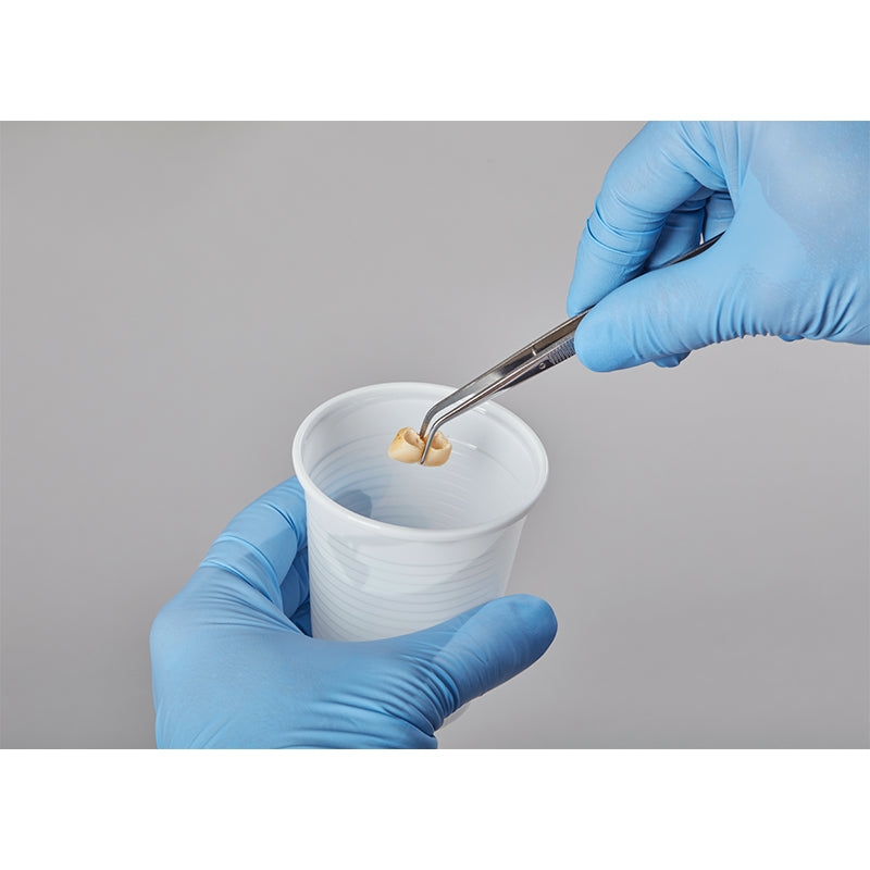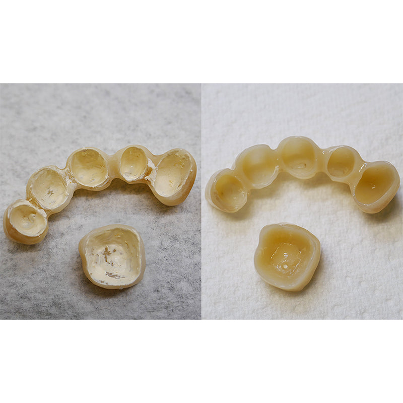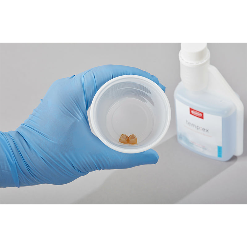 With temp:ex, you can gently peel and remove temporary cement residues without damaging the restoration surface. Simply immerse the crown or bridge in the cleaning solution and let it work - while you focus on other tasks. After 10 minutes (or 5 minutes if the SYMPRO cleaning unit is being used), your restoration is now clean and ready for use.