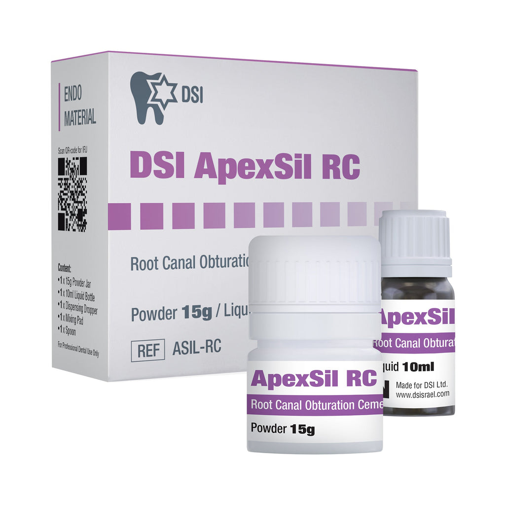 DSI Apexsil RC is a radiopaque, non-resorbable, zinc oxide-Eugenol-based root canal sealer. Its composition is well tolerated by the tissues and provides anti-inflammatory action. It was designed for root canal treatments, featuring exceptional adhesion to the walls as well as reduced polymerization shrinkage. In addition, its antibacterial action helps to avoid infection. The reinforcing agent is integrated into ApexSil powder instead of liquid to improve mixing qualities.
