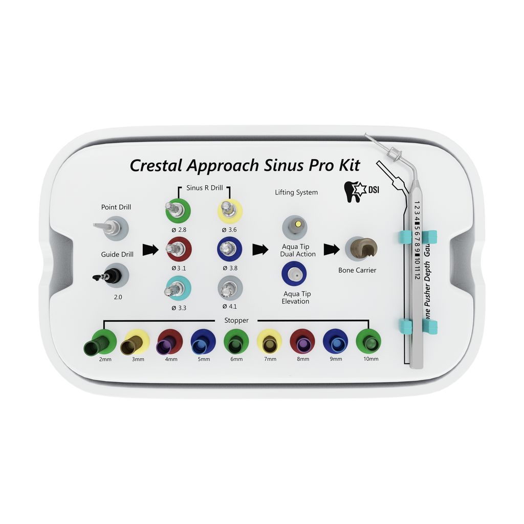 The DSI Crestal Pro Kit is designed to provide a crestal sinus approach for sinus lift, which offers a more effective and safer procedure than other methods. This toolkit includes tools for sinus lifting and it is ideal for any dental professional that needs an uncomplicated technique for performing closed sinus lifting procedures. DSI Crestal Pro Kit comes with dual action aqua tip providing a unique solution for raising the sinus membrane. This is a patented tip designed to make the sinus lifting procedure more efficient and easy. The tip fills the sinus pocket with liquid and pushes the membrane. The liquid comes out on both sides of the tip. There is also an option to push the membrane with the silicone tip that comes out, then continue to push the membrane with liquid.
