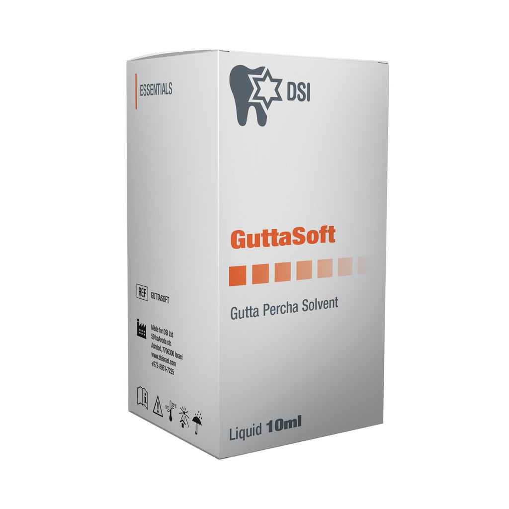 DSI GuttaSoft breaks down the gutta-percha, making it easier to remove from the root canal. It is the perfect choice for endodontic root canal treatment. DSI GuttaSoft is non-hazardous, non-carcinogenic, and based on natural substances. It does not irritate the oral mucosa, also it is an economical solution as it allows for efficient use of the material.