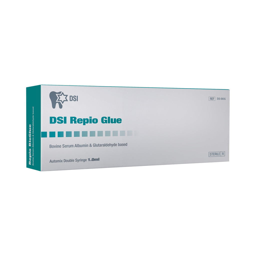 DSI Repio Glue adhesive is remarkable in its ability to form strong bonds both between tissue layers and with bone grafts. It can be used to adhere bone to bone, graft to bone, and tissue to tissue. That fact makes the DSI Bio-Glue ideal for sinus lifting procedures. It has the required strength to stop bleeding in a moist environment and It has a fast drying formula of only 120 seconds.