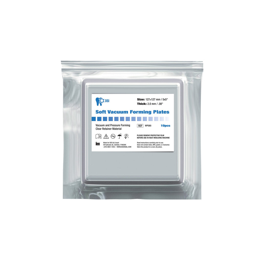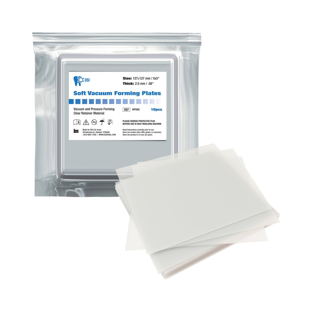 DSI Soft-Tray forming plates are meticulously crafted to produce custom-made whitening trays, soft bruxing guards, and personalized fluoride trays for any patient. These plates are easy to trim and fabricate, ensuring maximum comfort for the patient. They excel in providing high detail, close tolerance, and precise adaptation to each patient's needs. They are constructed from high-quality thermoplastic and feature pure-grade, latex-free sheets. These plates resist bubbling, crazing, fracturing, and tearing while maintaining exceptional dimensional stability.