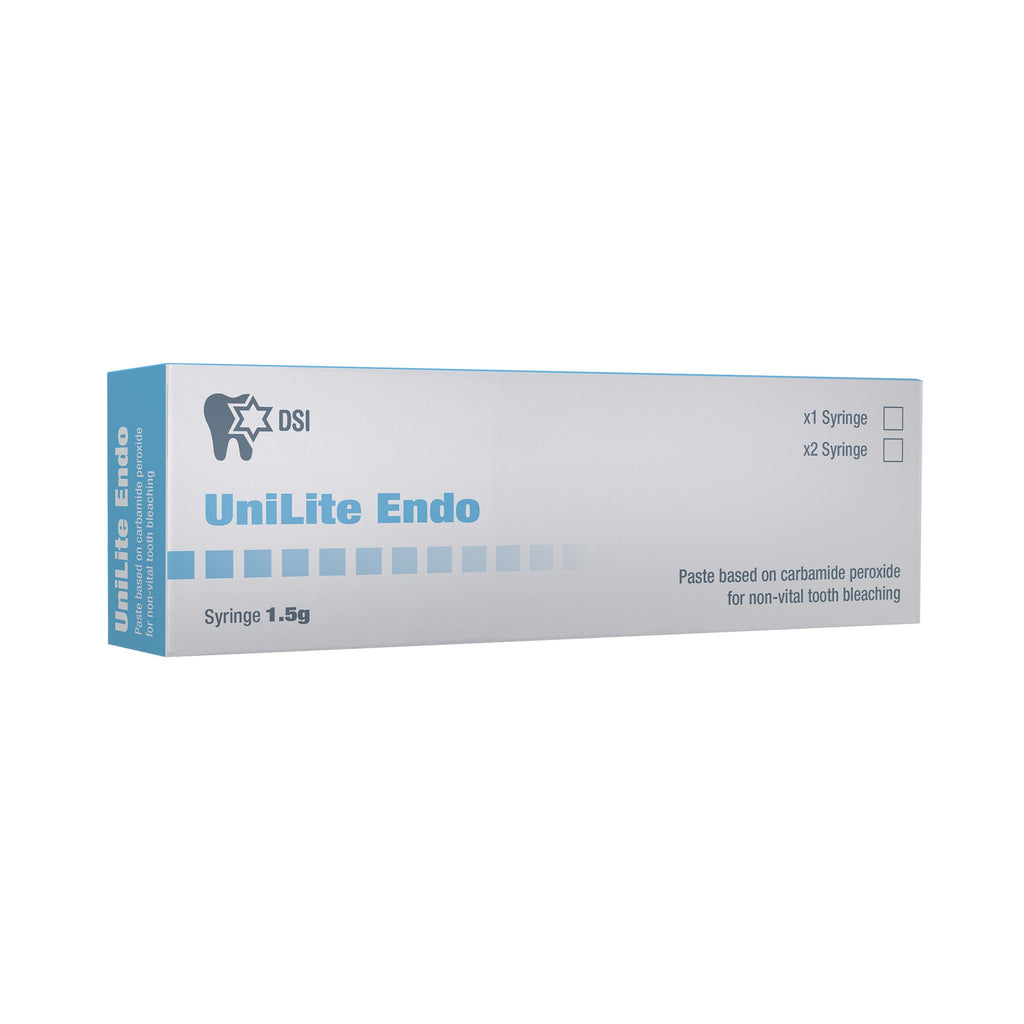 DSI Unilite Endo is a specially formulated bleaching material containing 60% Carbamide Peroxide, allowing for a pulp chamber whitening effect in 3-5 days. DSI Unilite Endo provides an economical, aesthetic solution to discolored teeth at an affordable price. Delivered in a conveniently pre-filled syringe, requiring very little preparation or chair time.