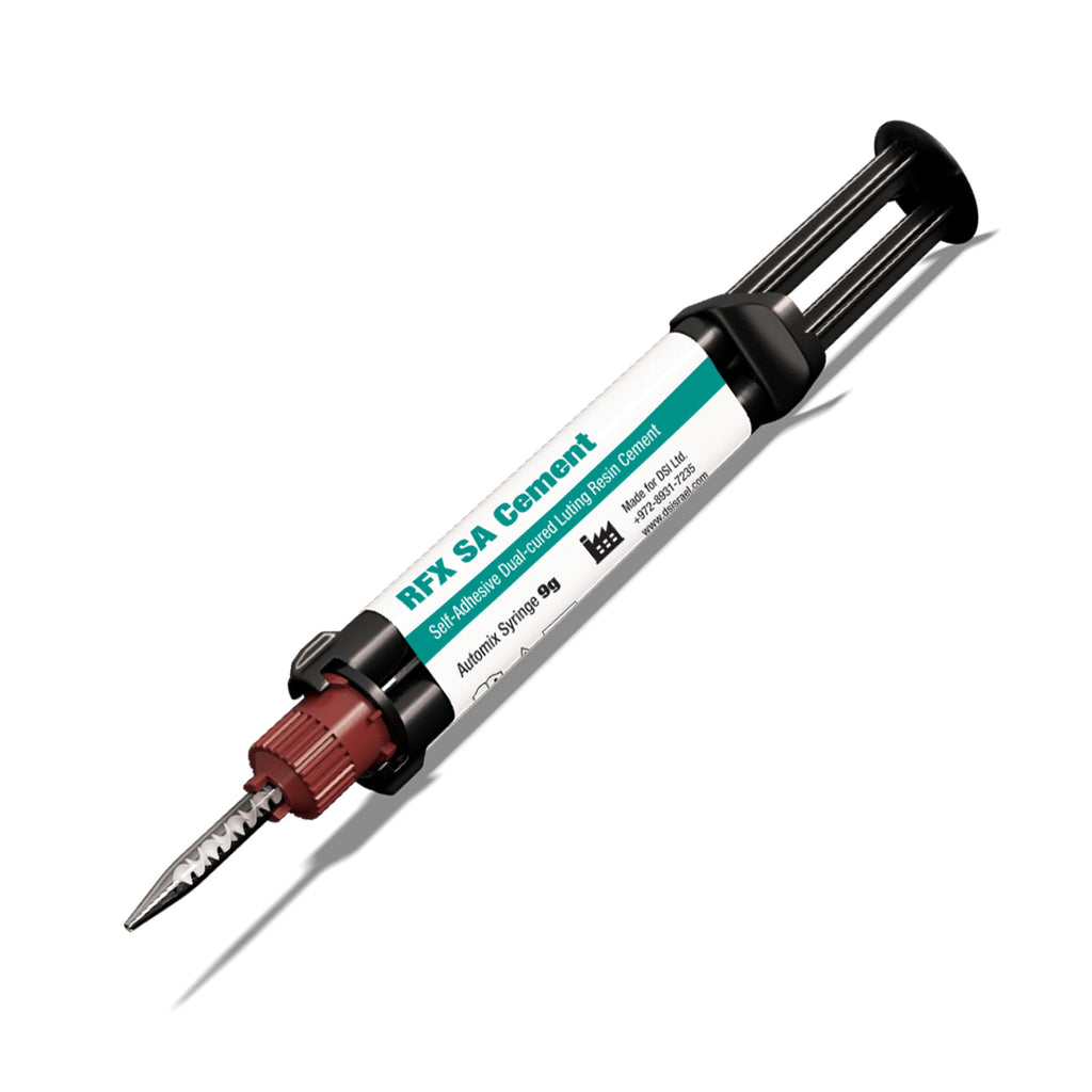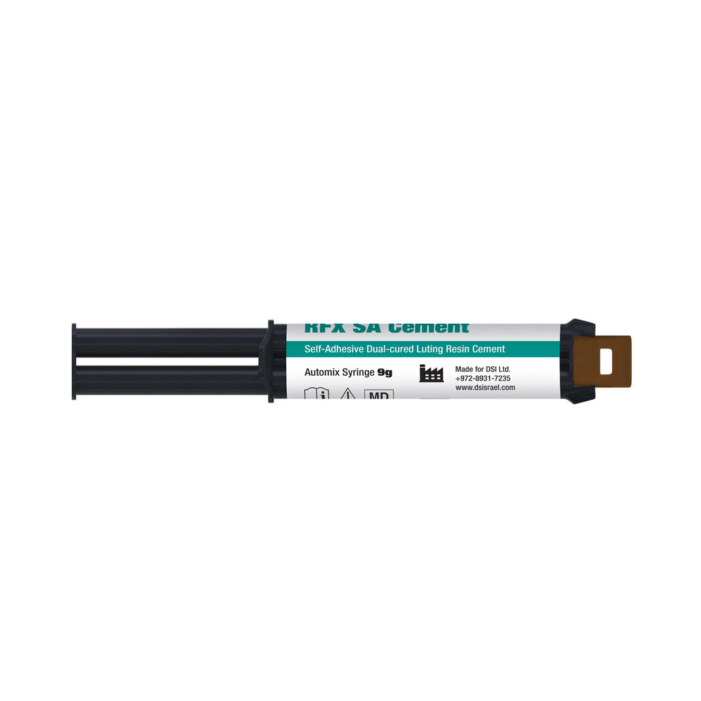 DSI RFX SA dual-cure self-adhesive resin cement is an optimal choice for securing crowns, bridges, inlays, onlays, and posts. This state-of-the-art resin technology presents a user-friendly automix syringe delivery system, boasting some of the most robust retention capabilities among self-adhesive cements.