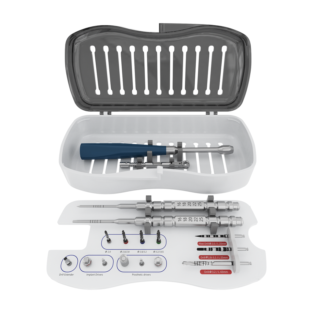 The DSI SK-DSY Grip Ptery Surgical Kit is designed for basal implants and includes all the essential tools like osteotomes and surgical drills to create a path for the basal implants. It is especially designed kit that allows implant placement in the pterygoid bone. The main advantage of this kit is the special osteotome that creates a socket in the pterygoid bone for immediate implantation. Designed for usage right after drilling with a pilot drill. The osteotome is inserted into the posterior region of the atrophic maxilla and helps pass the cortical bone and reach the pterygoid bone. A perfect tool for placing basal implants.